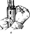 | Надіти пружину на задній кінець штовхача; ввести передній кінець штовхача у газову трубку, стиснути пружину і ввести задній кінець штовхача з пружиною у канал прицільної колодки (рис. а).