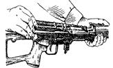| Ввести зворотний механізм у канал затворної рами, стискаючи зворотні пружини, вставити виступи на передньому кінці кришки у вирізи на нижньому упорному кільці; натиснути на задній кінець кришки до повного її прилягання до ствольної коробки, повернути замикач кришки ствольної коробки вперед до постановки його на фіксатор