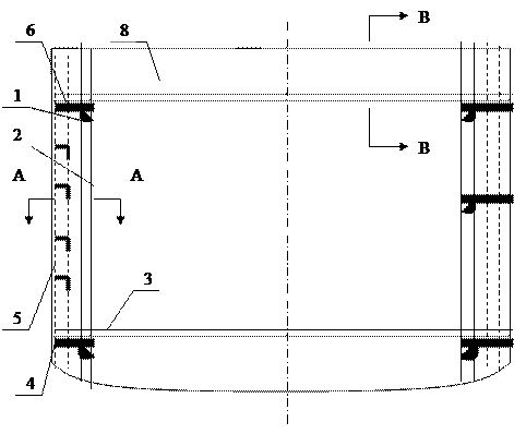 Кроме того, на корпус судна действуют также силы от скручивающегося момента на волне; для противостояния этим силам корпус судна снабжен элементами корпусного набора в виде металлоконструкций различных профилей на рисунке(2, 3, 4, 5, 6); приваренных полуавтоматической электродуговой сварки изнутри к наружной обшивке корпуса судна.