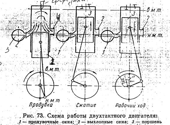 После вспышки воспламененная топливом воздушная смесь, резко расширяясь, толкает поршень из ВМТ в НМТ, происходит рабочий ход. В конце рабочего хода открывшиеся сначала выпускные окна, и выпускные газы выталкиваются в выхлопной коллектор. Затем открываются продувные окна и под давлением поступает свежий воздух, который сначала выталкивает остатки выхлопных газов, продувает цилиндр и заполняет свежим сжатым воздухом пространство цилиндра. Поршень дошел до НМТ. Затем все повторяется.