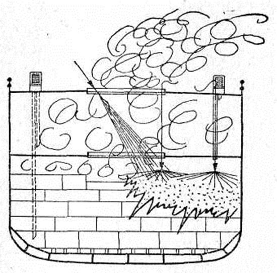 При пожаре в твиндеке такое мероприятие обеспечит лишь защиту самих каналов и предотвратит переход огня по ним в вышерасположенные помещения. При подаче пены через вентиляционные головки, дефлекторы необходимо, чтобы они были повернуты навстречу ветру. Если стволы или пену нельзя подать в очаг через люки или вентиляционные каналы, то для этого в местах наибольшего прогрева палубы и переборок проделывают небольшие отверстия.