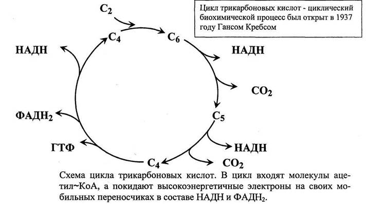 Таким образом, двухуглеродный фрагмент молекулы ацетил-КоА подвергается полному окислению. Электроны, ранее принадлежащие молекуле ацетил~КоА, покидают цикл в связанной форме: в виде 3 молекул НАДН и