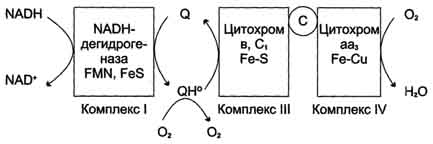 В отличие от рассмотренного механизма на этапе переноса электронов при участии цитохромоксидазы (комплекс IV) "утечка" электронов не происходит благодаря наличию в ферменте специальных активных центров, содержащих Fe и Сu и восстанавливающих О2 без освобождения промежуточных свободных радикалов.