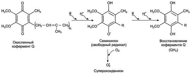 Образование супероксида в ЦПЭ. "Утечка" электронов в ЦПЭ может происходить при переносе электронов с участием коэнзима Q. При восстановлении убихинон превращается в анион-радикал семихинона. Этот радикал неферментативно взаимодействует с О2 с образованием супероксидного радикала. Комплекс II на рисунке не указан.