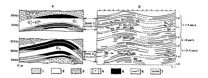 5 – нафтогазонасичені, 6 – відбиття від границь розділу в осадовій товщі,