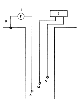 Для заміру позірного опору в свердловину на спеціальному кабелі спускають зонд, який складається переважно з трьох електродів A, M, N. Четвертий електрод В встановлюють на поверхні. Електроди А і В призначені в схемі для пропускання електричного струму, а електроди M i N – для вимірювання різниці потенціалів між двома точками середовища в момент перебігу електричного струму. Принципова схема вимірювання позірного опору зображена на рисунку 10.1.