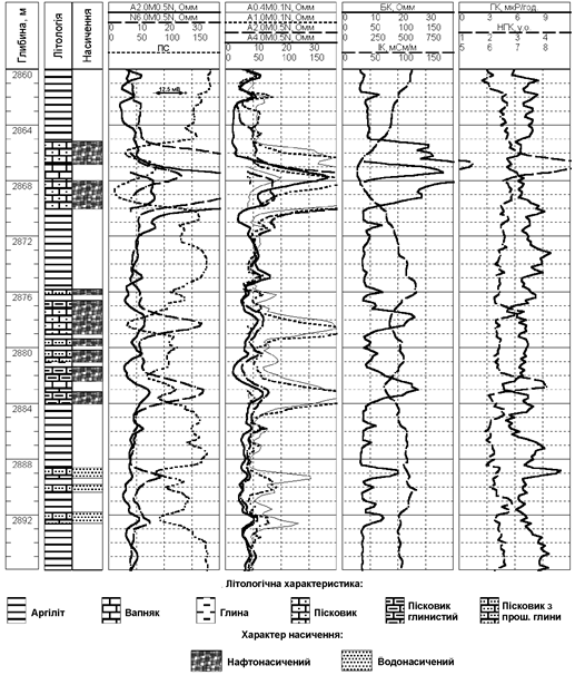 На рис. 10.5 наведено результат оперативної інтерпретації даних стандартного комплексу ГДС за допомогою комп’ютеризованої технології “Геопошук” з метою побудови геологічного розрізу свердловини та оцінки характеру насичення пластів-колекторів.