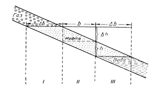 При відомому положенні ГНК і ВНК розміри виявленої бурінням нафтової облямівки пластового покладу визначаються розрахунковим шляхом. На рисунку показано, що в нафтовій облямівці повнопластового покладу можуть бути виділені 3 зони: підгазова (І), повнопластова (ІІ) і водоплавна (ІІІ) (рис. 14.3).