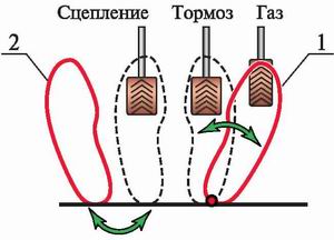 Рис. 9. Постоянное положение ног водителя:1 –"дом" правой ноги; 2 – "дом" левой ноги