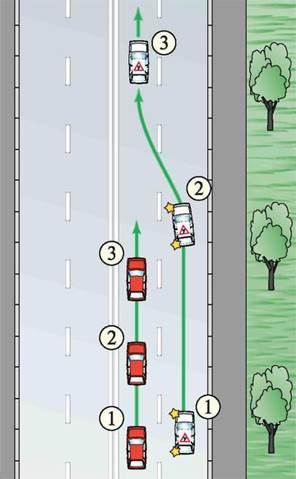 Поэтому на первое время более приемлемым вариантом перестроения будет – уменьшение скоростии опять-таки плавное "вливание" в соседнюю полосу (рис. 61).