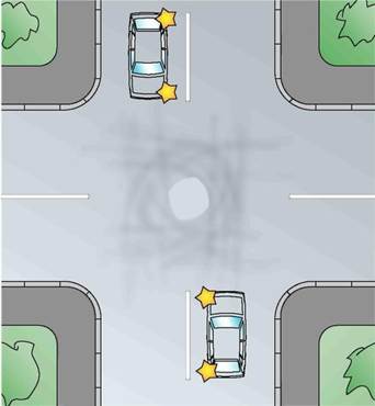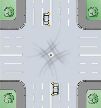 Поскольку шины автомобилей на поворотах активно "чертят" по дороге, то на сухом асфальте центр перекрестка будет явно просматриваться в виде белой "подушечки" (рис. 76 и 77). Причем контуры такого "центра" подскажут вам еще и принятую для этого перекрестка траекторию поворота налево. Зимой на центре перекрестка лежит нетронутый снег, а во время дождя центр перекрестка тоже неплохо виден – он блестит.