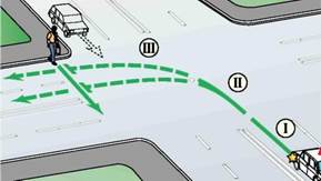 • Поворот налево через воображаемый центр перекрестка обеспечивает безопасность маневра.