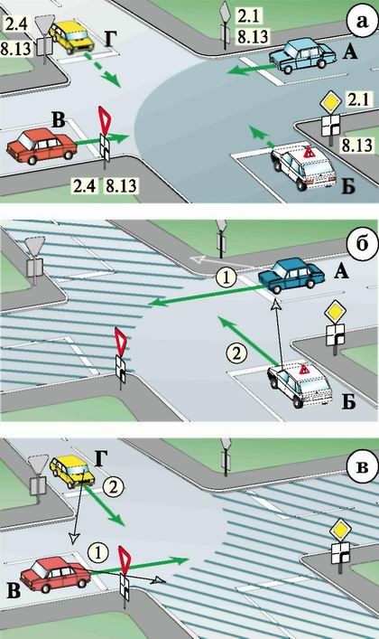 После того, как разъедется транспорт с главной дороги, можно будет вспомнить и о машинах на второстепенной дороге (рис. 108в). А там все происходит по такому же сценарию. Не имеющий помехи справа автомобиль "В" проезжает первым, и автомобиль "Г" – вторым.