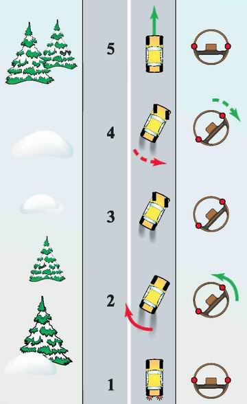 Вданном конкретном случае это выглядит так: "Резко нажали педаль тормоза – Начался занос – Отпустите педаль тормоза!"и "Крути руль навстречу багажнику – налево!", так как багажник вашего автомобиля пытается "обогнать" вас сейчас именно слева.