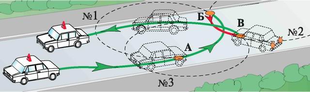 А посмотрите на круг № 3! Ведь он не затрагивает левый тротуар. Значит, нам надо каким-то образом перейти с одного круга на другой. Сделать это можно только с использованием круга заднего хода (№ 2). Причем переходы с круга на круг вы должны научиться делать на кратчайшем расстоянии. Для этого в точках "Б" и "В" колеса вашей машины надо будет развернуть в другую сторону.