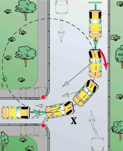 • Двигаться по "кругу" большего диаметра. Это позволит вам не наехать передним правым колесом на тротуар, а также обеспечит въезд в "бокс" по плавной траектории. Для этого руль следует поворачивать медленно, постоянно контролируя изменения в траектории движения.