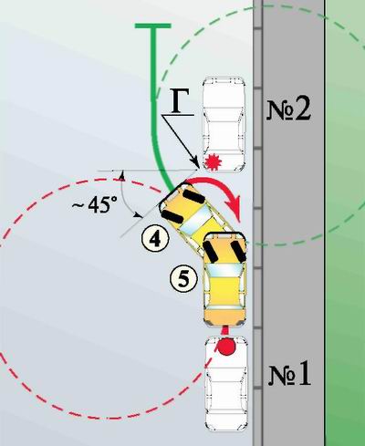 После того, как бампер вашего автомобиля минует угол машины № 2 и вы, повернув руль налево, окажетесь на втором кругу, внимание надо будет переключить на машину № 1 и тротуар. В позиции 5 (параллельно тротуару), в зависимости от ваших дальнейших планов, вы можете: