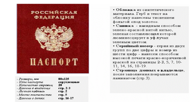 Паспорт представляет собой книжку с обложкой из переплетных материалов и внутренними листами бумаги, на которых типографским способом исполнены тексты, фоновые сетки, различные рисунки.