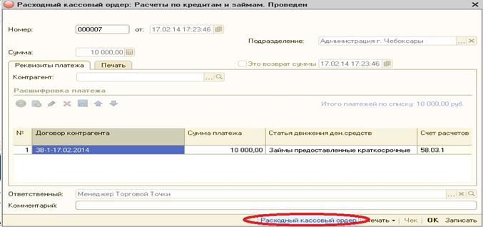Далее печатаем «расходный кассовый ордер» (РКО) в 1-м экземпляре.