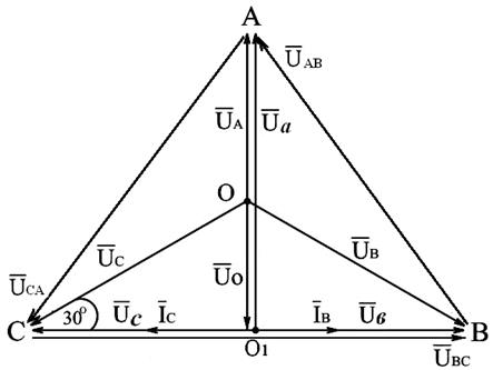 Рис.3.14. Векторная диаграмма напряжений и токов трёхфазной системы, соединённой звездой, без нулевого провода с выключенной фазой