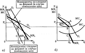 Допустим, на отраслевом рынке конкурируют три (I, II и III) фирмы. Рассмотрим реакцию фирм II и III на поведение фирмы I. Возможны две ситуации: когда она повышает цены и когда она их понижает. В случае, если фирма I повышает цены выше Р0 (рис.50.а), ее спрос изображается кривой D1 выше линии Р0А. Конкуренты (фирмы II и III) не будут за ней следовать, и их цены либо останутся неизменными, либо вырастут в гораздо меньшей пропорции, как показывает кривая D2 выше линии Р0А. При понижении фирмой I цены ниже Р0 фирмы 11 и III будут следовать за ней, что показывает кривая D1 ниже линии Р0А. В результате возникает ломаная кривая спроса D2AD1, высокоэластичная выше уровня текущей цены Р0 и малоэластичная ниже нее (рис. 50.б).