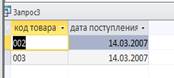 Пример 2. Используя данные из таблицы Поступление товара,найти товары, поступившие на склад магазина 14.03.2007.