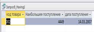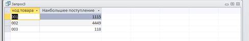 SELECT [ПОСТУПЛЕНИЕ ТОВАРА].[Код товара], Max(Поступление) AS [Наибольшее поступление], [ПОСТУПЛЕНИЕ ТОВАРА].[дата поступления]