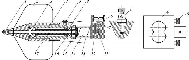 Вертушка ГР-99 (рис. 6) состоит из корпуса, ходовой части и контактного устройства. Ходовая часть размещена в передней части корпуса и представляет собой трехлопастной винт, установленный на оси и закрепленные гайкой два шарикоподшипника, распорную втулку, гильзу. Ходовая часть крепится к корпусу винтом.