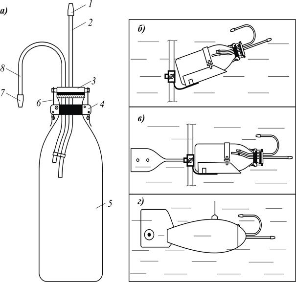 Батометр-бутылка (рис. 13) предназначен для отбора проб на мутность в отдельных точках и интеграционным способом. Он представляет собой литровую бутылку с металлической пробкой-головкой, в которую вмонтированы водозаборная и воздухоотводная трубки. При отборе пробы батометр устанавливается на заданную глубину с помощью штанги или лебедки. В первом случае (см. рис. 13б, в) он вставляется в специальную обойму, закрепленную на штанге под углом 25° или горизонтально, а во втором помещается в полый груз рыбовидной формы (см. рис. 13г). Горизонтальное расположение батометра позволяет отбирать пробы вблизи дна.