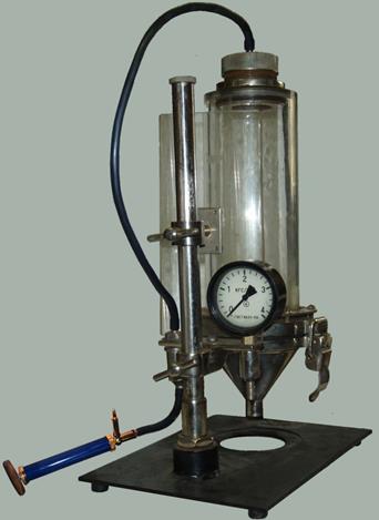 Прибор представляет собой цилиндрическую камеру емкостью 1 л, шарнирно соединенную при помощи зажима с воронкообразным основанием. Сверху воронка прикрыта мелкой сеткой, на которую укладывается фильтр. В верхнюю крышку камеры вмонтирован резиновый шланг, к другому концу которого присоединяется насос. На время заливки пробы в камеру крышка снимается, а потом плотно закрывается. После того как фильтр установлен, а камера наполнена водой, в нее нагнетают насосом воздух, под давлением которого вода фильтруется тем быстрее, чем меньше в ней глинистых и илистых частиц.