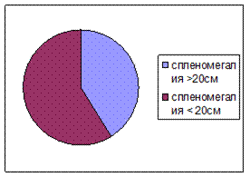 Спленомегалия была выявлена у 155 (97 %) из 160 больных ВКЛ, с одинаковой частотой при разных формах заболевания – у 98 % больных с типичной формой ВКЛ, у 93 % - с вариантной формой ВКЛ и у 98 % - с ВКЛ молодого возраста (рис.6). У 5 (3 %) из 160 больных размеры селезенки были нормальными. Значительная спленомегалия (более 20х6см) чаще, но статистически недостоверно (57 % против 39 %, р=0.076) встречалась при вариантной, чем при типичной форме ВКЛ. При типичной форме ВКЛ значительную спленомегалию чаще наблюдали среди женщин (51 % против 33 %, р=0.05), а при вариантной форме ВКЛ соотношение мужчин и женщин со значительной спленомегалией было примерно равным (58 и 50 % соответственно, р=0.59). Учащение случаев значительной спленомегалии (>20см) у больных молодого возраста (41 % против 36 % старшего возраста) было статистически недостоверным (р=0.80).