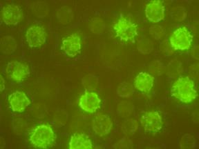 Для уточнения иммунофенотипа лимфоцитов крови был проведен повторный иммунофенотипический анализ 2 способами – методом непрямой иммунофлюорисценции с фазово-контрастной микроскопией и повторный методом проточной цитофлюориметрии.