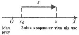 Нехай тіло в момент початку руху знаходиться в точці з координатою хо (мал.); через деякий час, здійснивши переміщення