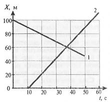 3. На малюнку зображено графіки руху двох тіл. Охарактеризуйте ці рухи і запишіть рівняння їх руху. Визначте швидкості руху цих тіл, час і місце їх зустрічі, відстань між ними через 20 с від початку руху другого тіла. Побудуйте графіки проекції швидкості vх == vx(t) для обох тіл.