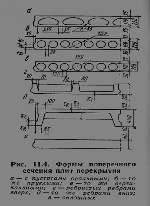 Плиты перекрытий опираются на ригели, работая на изгиб, и для уменьшения расхода материалов проектируются облегченными — пустотными или ребристыми. По форме поперечного сечения пустотные плиты бывают с овальными, круглыми и вертикальными пустотами, ребристые — с ребрами вверх, с ребрами вниз, сплошные. Общий принцип проектирования плит перекрытий любой формы поперечного сечения состоит в удалении возможно большего объема бетона из растянутой зоны ссохранением вертикальных ребер, обеспечивающих прочность элемента по наклонному сечению, в увязке стехнологическими возможностями завода-изготовителя. Наиболее экономичны по расходу бетона плиты с овальными пустотами