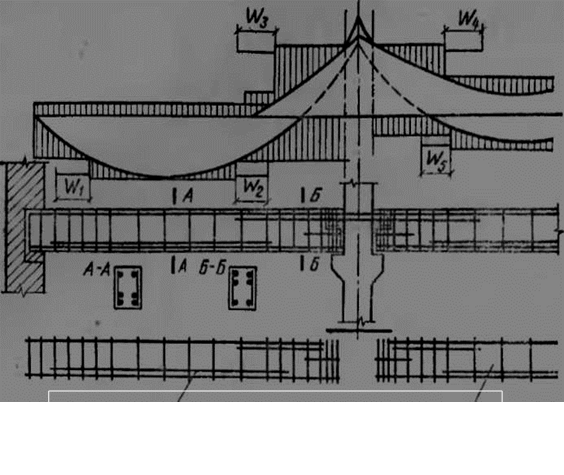 Ригель многопролетного перекрытия представляет собой элемент рамной конструкции. При свободном опирании концов ригеля на наружные стены и равных пролетах его рассчитывают как неразрезную балку. Для неразрезных балок упрощенный способ учета перераспределения усилий такого рода состоит в следующем. Опорные моменты вычисляют как в упругой системе и умножают на поправочные коэффициенты, оценивающие неодинаковую жесткость опорных и пролетных сечений. Далее по исправленным опорным моментам обычным путем вычисляют пролетные моменты. Поперечное сечение ригеля может быть прямоугольным, тавровым с полками вверху, тавровым с полками внизу