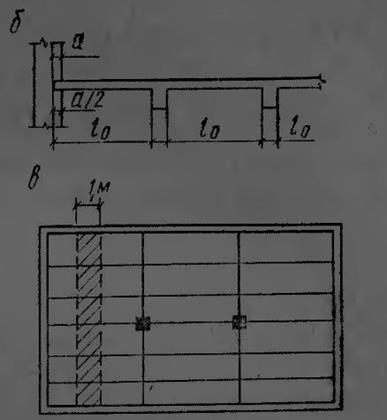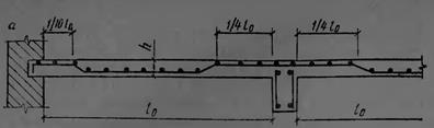 13. Расчетный пролет плиты принимают равным расстоянию в свету между второстепенными балками L0 и при опирании на наружные стены — расстоянию от оси опоры на стене до грани ребра; для расчета плиты в плане перекрытия условно выделяется полоса шириной 1 м .