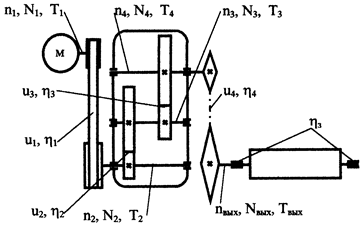1. Составить кинематическую схему привода согласно заданию (рис. 3). Ввести обозначения: