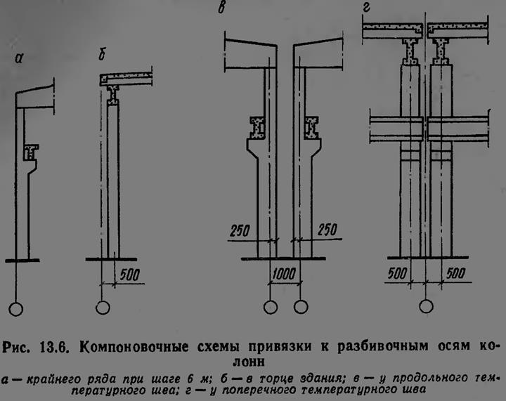 Продольный температурный шов выполняют, как правило, на спаренных колоннах со вставкой (рис. 13.6, в), при этом колонны у температурного шва имеют привязку к продольным разбивочным осям 250 мм (или нулевую при 6 м). Поперечный температурный шов также выполняют на спаренных колоннах, но при этом ось температурного шва совмещается с поперечной разбивочной осью, а оси колонн смещаются с разбивочной оси на 500 мм (рис. 13.6, г).