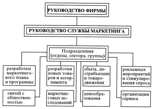 Во главе службы маркетинга стоит ответственный руководитель (вице-президент фирмы по маркетингу, маркетинг-директор и т.п.), который координирует деятельность подразделений службы маркетинга между собой и другими службами фирмы, утверждает план и бюджет маркетинга, дает задания сотрудникам и контролирует их деятельность.