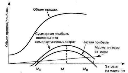 Функция показывает, что объем сбыта растет при увеличении затрат на маркетинг. Данная кривая имеет S-образную форму, т.е. низкие затраты на маркетинг не приводят к значительному росту объема сбыта, при увеличении этих затрат эффективность сбыта растет, но после определенных значений затрат на маркетинг – падает (наступает насыщение рынка). Возможны и другие виды данной зависимости. Из этой функции удаляют все немаркетинговые издержки, получая кривую валовой прибыли. Далее затраты на маркетинг, изображенные в виде прямой линии, принимающейся из начала координат под углом, определяемым отношением одного рубля маркетинговых затрат к десяти рублям объема продаж (вертикальная ось), вычитаются из кривой валовой прибыли, и таким путем определяется кривая чистой прибыли. Кривая чистой прибыли имеет положительное значение между низкими и высокими значениями затрат на маркетинг (точки Мн и Мв). В этом диапазоне затрат на маркетинг, называемом рациональным диапазоном, величина чистой прибыли достигает максимального значения.