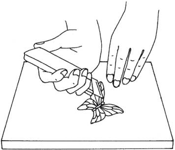 Если в рисунке задуманы детали с небольшими окружностями, вырезай их полукруглой стамеской. Если же ее у тебя нет, это можно сделать косым ножом. При этом помни: чем меньше диаметр окружности, тем острее должен быть угол заточки клинка (до 30°). Этим инструментом (косым ножом) можно резать во всех направлениях: от себя, на себя, с наклоном вправо, влево, внутрь окружности или наружу.