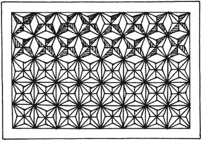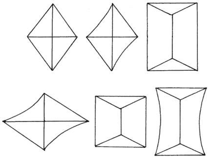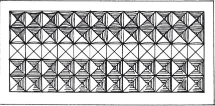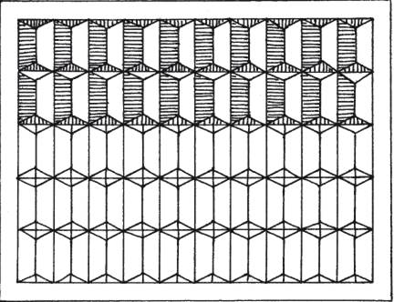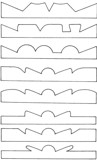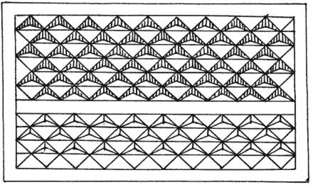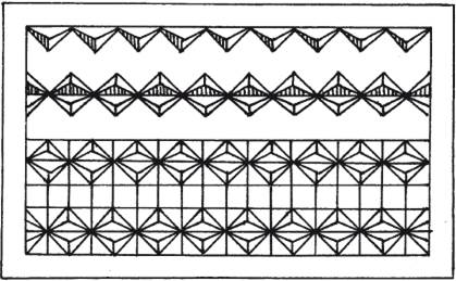 Более сложными для выполнения являются четырехгранные выемки. Они также различаются по своей форме, глубине и исполнению. Четырехгранные выемки могут иметь форму прямоугольника, квадрата или ромба. Часто встречаются разнообразные круглые и полукруглые глазки, лучики и фонарики, которые не являются основными элементами геометрической резьбы, но очень оживляют ее. Даже с помощью самых простых фигур можно создать красивый орнамент. Например, из сочетания одинаковых двугранных выемок возникают известные орнаменты «лесенка» и «соты» (рис. 59).