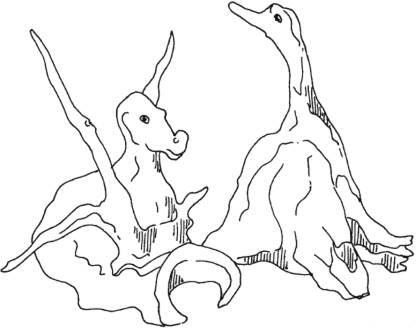 Деревянная скульптура — это весьма обширное понятие, включающее в себя декоративные скульптуры и композиции, декоративно-прикладные изделия, миниатюры, малые жанровые скульптуры, разные украшения и лесные находки. К декоративной скульптуре и композициям можно отнести также фигурки птиц, животных, людей и различных сказочных персонажей, которые сделаны из отмершей древесины (рис. 74). Нечасто можно достичь того, чтобы получившаяся композиция хорошо смотрелась со всех сторон. Здесь прежде всего важно то, как поставить ее, чтобы образ наиболее четко предстал перед зрителями. Такие фигурки могут как висеть на стенке, так и стоять на какой-либо поверхности.