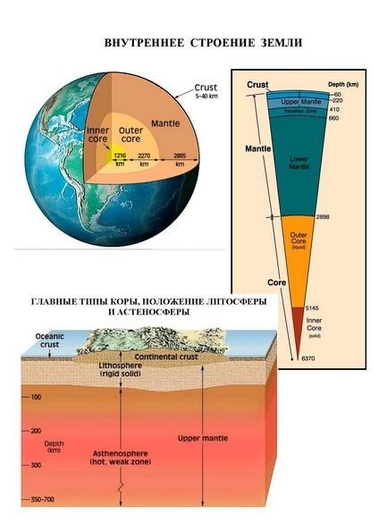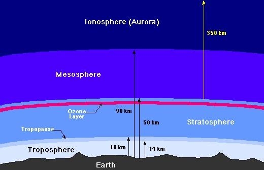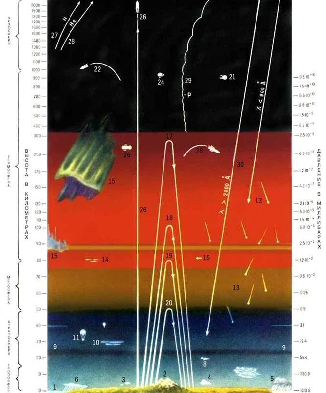 Нижняя часть атмосферы, содержащая около 80% всей её массы, называется тропосферой. Она распространяется до высоты 16—18 км в экваториальном поясе и до 8—10 км в полярных широтах. Температура тропосферы понижается с высотой в среднем на 0,6. К на каждые 100 м. Над тропосферой до высоты 55 км расположена стратосфера, в которой заключено почти 20% массы атмосферы. От тропосферы она отделена переходным слоем — тропопаузой, с температурой 190—220 К. До высоты ~25 км температура стратосферы несколько падает, но дальше начинает расти, достигая максимума (~270К) на высоте 50—55 км. Этот рост связан главным образом с увеличением в верхних слоях стратосферы концентрации озона, интенсивно поглощающего ультрафиолетовое излучение Солнца. Над стратосферой расположены мезосфера (до 80 км), термосфера (от 80 км до 800—1000 км) и экзосфера (выше 800—1000 км). Общая масса всех этих слоев не превышает 0,5% массы атмосферы. В мезосфере, отделённой от стратосферы стратопаузой, озон исчезает, температура вновь падает до 180—200К. вблизи её верхней границы (мезопаузы). В термосфере происходит быстрый рост температуры, связанный главным образом с поглощением в ней солнечного коротковолнового излучения. Рост температуры наблюдается до высоты 200—300 км. Выше, примерно до 800—1000 км, температура остаётся постоянной (~1000К), т.к. здесь разреженная атмосфера слабо поглощает солнечное излучение.