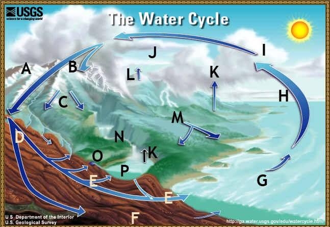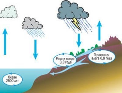 Вода образует прерывистую оболочку Земли. Около 94% общего объёма гидросферы сосредоточено вокеанах и морях; 4% заключено в подземных водах; около 2% — в льдах и снегах (главным образом Арктики,Антарктики и Гренландии); 0,4% — в поверхностных водах суши (реки, озёра, болота). Незначительноеколичество воды содержится в атмосфере и организмах. Все формы водных масс переходят одна в другую впроцессе обращения. Ежегодное количество осадков, выпадающих на земную поверхность, равноколичеству воды, испарившейся в сумме с поверхности суши и океанов. В общем круговороте влагинаиболее подвижны воды атмосферы.