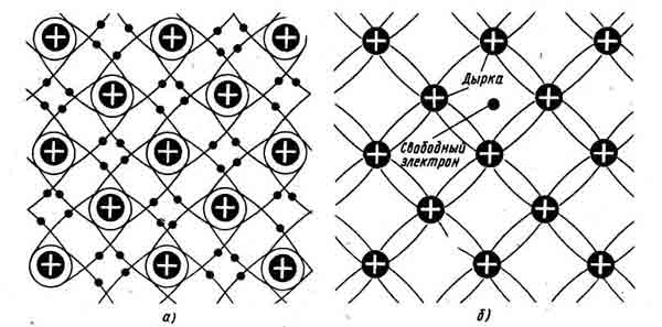 При температуре, близкой к абсолютному нулю, полупроводник ведет себя как абсолютный непроводник, потому что в нем нет свободных электронов. Если повышения температуры нет, связь валентных электронов с атомными ядрами ослабевает и некоторые из них вследствие теплового движения могут покидать свои атомы. Вырвавшийся из межатомной связи электрон становится свободным (на рис. 1, б - черная точка), а там, где он был до этого, образуется пустое место. Это пустое место в межатомной связи полупроводника условно называют дыркой (на рис. 1 ,б - разорвавшаяся линия электрона). Чем выше температура полупроводника, тем больше в нем появляется свободных электронов и дырок. Таким образом, образование в массе полупроводника дырки связано с уходом из оболочки атома валентного электрона, а возникновение дырки соответствует появлению положительного электрического заряда, равного отрицательному заряду электрона.