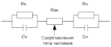 На участке между двумя электродами общее электрическое поле человека состоит из сопротивления 2х наружных слоев кожи касающихся электродов и внутреннего сопротивления остальной части тела человека. Многочисленные опыты показали что внутреннее сопротивление можно рассматривать как активное. Его величина зависит от длины и поперечного размера участка тела, по которому проходит ток. Наружное сопротивление состоит из двух как бы параллельно соединенных сопротивлений: активного и емкостного.