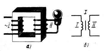 | Рис. 5 Трансформатор с магнитопроводом из стали: а - усторйство в упрощенном виде; б - схематическое изображение. |