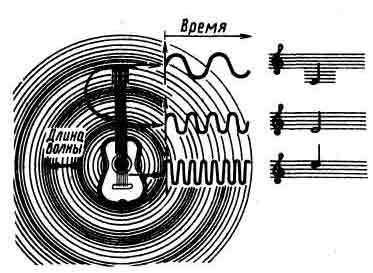 | Рис. 1. Чем больше частота колебаний струны, тем короче звуковые волны и выше тон звука. |